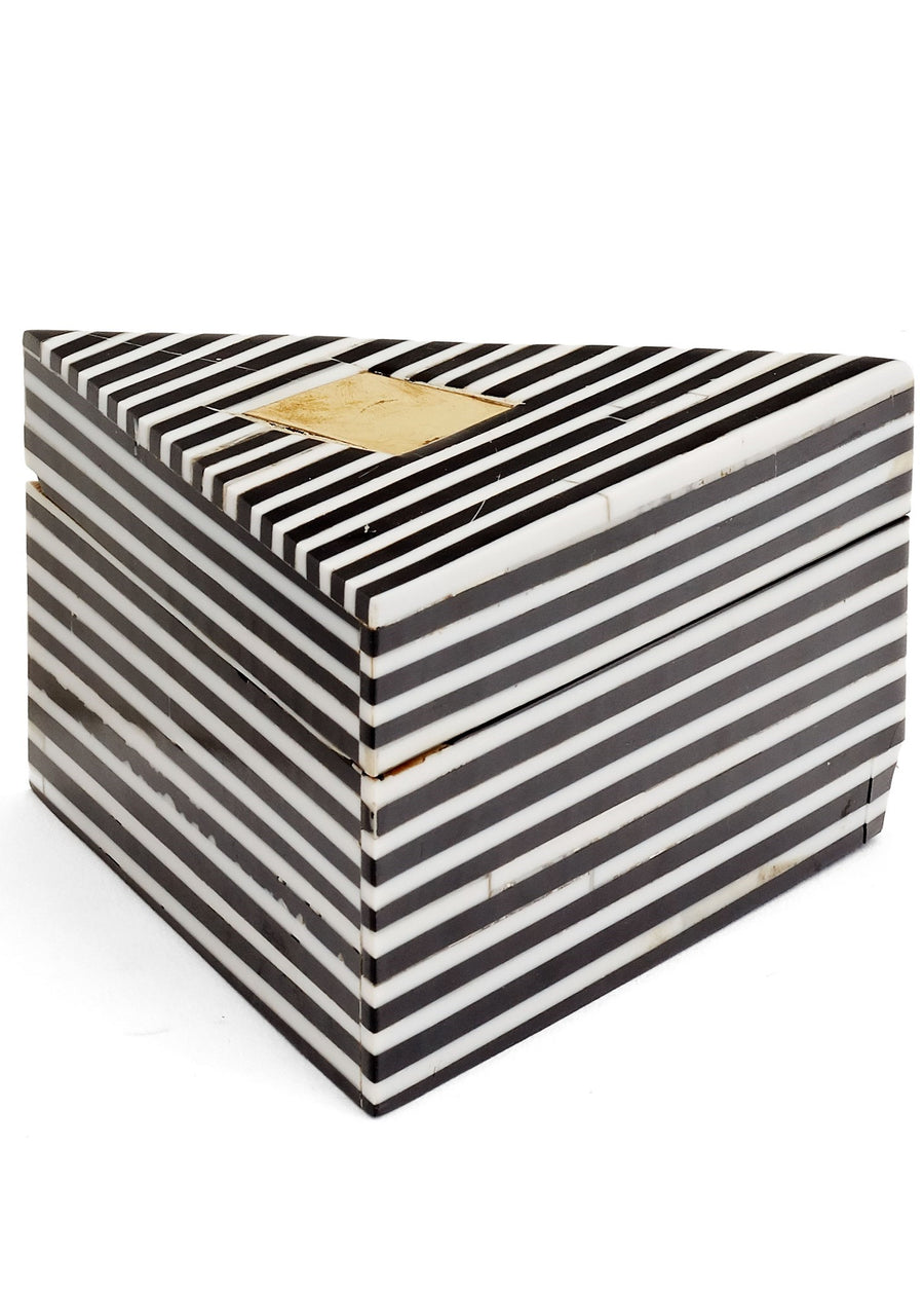 Add a touch of luxury to your home with the Knoll Box. Crafted from black and white striped resin with a gold embellishment, this unique triangle-shaped piece is perfect for displaying jewelry and trinkets, or as a decorative object. Capturing the essence of exclusive sophistication, the Knoll Box is sure to make a statement.