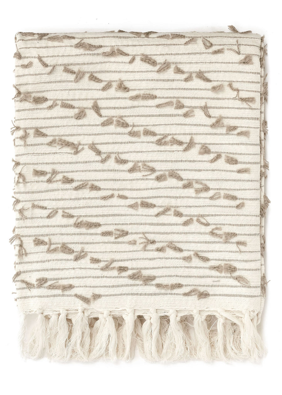 Elevate your home decor with our sophisticated France Throw, featuring a luxurious white and taupe embroidered design adorned with delicate tassels.